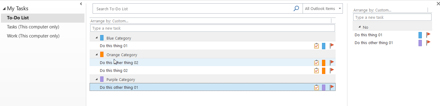 Task items have several user-defined fields on them. One is called Ready to Work. The other is Scheduled. Both are Yes/No fields. As I go through the long list of all tasks, I set Ready To Work to yes if I’m going to do it this week. I have the To-Do Bar turned on and grouped by Scheduled and filtered by Ready to Work = Yes. This gives me this view of tasks that are ready to be worked on: