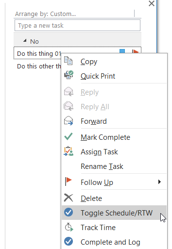 The final stage is to switch to the calendar view and start choosing the tasks I need to work on today. I add the task to my calendar and then right-click the task, selecting a custom function called Toggle Schedule/RTW.